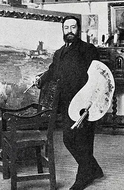 He studied in Rome between 1891 and 1895 to perfect his technical knowledge,[3] although he visited Spain frequently. He was sponsored by the Diputación de Burgos and during his stay in Italy he painted one of his most famous works: El Triunfo de la Santa Cruz, which was exhibited at the International Exhibition of Madrid and at the Universal Exhibition of Chicago (1893),[4] where he won the unique award medal This canvas represents the famous battle of Las Navas de Tolosa and is currently displayed in the Marceliano Santa María Museum in Burgos. After this success he continued exhibiting his works in the main cities of Spain.