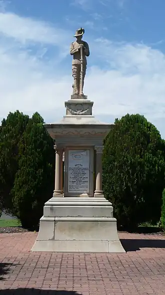 The Dungarees set out from Glengallan in the early afternoon of 16 November 1915 for the 16 kilometre march to Allora. They stopped at Mount Marshall for afternoon tea, before heading into Allora for the night. The shops were decorated with bunting, the school bell rang out, and the town band accompanied them into town. They stopped to pay their respects at the Boer War Memorial where the Allora Mayor, Cr T Muir, made a speech. The memorial had been unveiled in 1904 by Colonel (later Sir) Harry Chauvel, honouring the four local men who died, and 35 others who served in the southern African conflict. The men were supplied with a hot dinner at Weatherley's Café.[6]