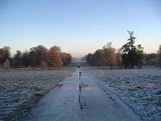 There are about 390 acres (1.6 km2) of the designed landscape, more or less in the same format as originally laid out. The gardens were originally arranged formally and to the south and south west or rear of the house. The layout can be seen in an early Ordnance Survey map of 1858.[12] A ha-ha separates the formal gardens from the deer park to allow a seamless view leading from the tightly arranged garden through into the wilder, but still man-ordered, a policy of the deer park. Here there are many mature trees, some thought to date from the late 18th century. In 1962 the tallest oak in Britain was recorded at Marchmont. Specimen trees surround the gardens and include a fine cut-leaf beech, an arbutus, a Wellingtonia, cedars and hollies.