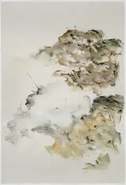 In later water-related projects, Cogswell's emphasis shifted toward sound, video and works on paper.[14][10][11] "Water Soundings: Zhujiajiao River Poems," (Zhujiajiao Art Museum, 2014) combined loose, abstract drawings in watercolor, ink, pencil and collage with local sounds and musical instruments and circular or rectangular video projections: a red lantern swaying in close-up, rainwater dripping off the eaves of an old house, a man harvesting snails with a rake at sunrise, a tai chi master practicing in the early morning.[10][2] "Red Hook Harbor Soundings" (Kentler International Drawing Space, 2015) incorporated audio, video, watercolor and pencil works mixing abstraction and representation that examined the vestiges of tidal flows and the beauty of disintegration found in a rotting pier, ship remnants and other detritus.[11]