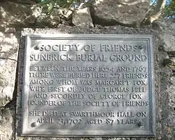 In late June 1652, George Fox visited Swarthmoor Hall. Margaret Fell met him, and later wrote that he "opened us a book that we had never read in, nor indeed had never heard that it was our duty to read in it (to wit) the Light of Christ in our consciences, our minds never being turned towards it before."[4] A day or two later it was lecture day at the parish church, she invited Fox to attend with them; he came in after the singing and asked for liberty to speak. Over the next weeks she and many of her household became convinced.[5] Over the next six years, Swarthmoor Hall became a centre of Quaker activity; she served as an unofficial secretary for the new movement, receiving and forwarding letters from roving missionaries, and occasionally passing along admonitions to them from Fox, Richard Hubberthorne, James Nayler, and others. She wrote many epistles herself and collected and disbursed funds for those on missions. After her husband's death in 1658, she retained control of Swarthmoor Hall, which remained a meeting place and haven from persecution, though sometimes, in the 1660s, raided by government forces.