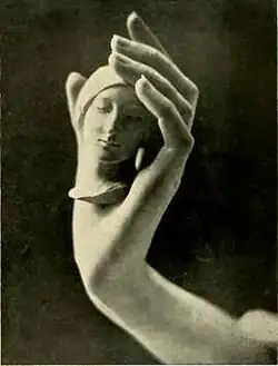 In 1931 she wrote the book The Art of the Body: Rhythmic Exercise for Health and Beauty, illustrated mainly with photographs of herself;[10][11] she notes in the preface that her dance technique derives from Ruth St. Denis (who in turn followed François Delsarte), but that her "system of 'aesthetic athletics'"[12] was based mainly on that of Bernarr Macfadden, an advocate of physical culture. She names the sexologist Havelock Ellis and the musicologist Sigmund Spaeth as major influences, stating that both had shown "an extraordinarily intuitive understanding"[12] of her work.[12] Agniel was depicted in an "elegant, though sharply ironic"[13] Palladium photographic print by the Canadian photographer Margaret Watkins, titled "Head and Hand". It shows her hand holding a portrait sculpture head of herself by Jo Davidson.[13]