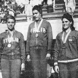 ![]() The athletes Mara Sacchi (left), Maria Antonietta Strumolo (center) and Maria Teresa Bringas (right) on the podium, during the awarding of the 100 m freestyle, at the V Mediterranean Games in Tunis 1967. | ||||||||||||