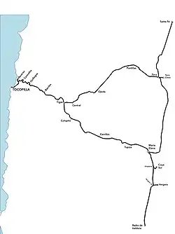 The Tocopilla railway was a mountain railway built to serve the sodium nitrate mines in the Toco area of Antofagasta Region, Chile. With a gauge of 3 ft 6 in (1,067 mm), it ran from the port of Tocopilla on the Pacific coast up to a height of 4,902 feet (1,494 m) with gradients up to 1 in 24.[1] The line was electrified in the mid-1920s,[2] and expanded in 1930 with the addition of lines serving new areas of mining.