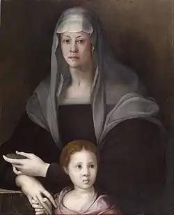 Maria Salviati (17 July 1499 – 29 December 1543) was a Florentine noblewoman, the daughter of Lucrezia di Lorenzo de' Medici and Jacopo Salviati. She married Giovanni delle Bande Nere and was the mother of Cosimo I de Medici. Her husband died 30 November 1526, leaving her a widow at the age of 27. Salviati never remarried; after her husband's death she adopted the somber garb of a novice, which is how she is remembered today as numerous late portraits show her attired in black and white.[1]
