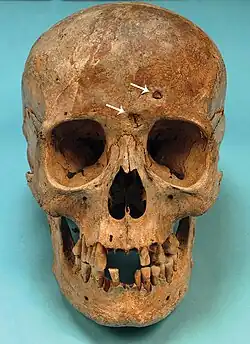 Syphilis became a prominent disease around the time of Maria's existence. Maria Salviati's skeletal remains showed skeletal lesions, corresponding to effects syphilis has in the third stage of the infection.[8] In the 1540s, Maria started to decline in health where the court physician, Andrea Pasquali, included symptoms such as recurring proctorrhagia, headaches, and rectal and perianal ulcers.[8] To further back the evidence of Maria's effect with syphilis, scientists and archeologist exhumed her skeletal remains and performed studies. Studies showed that Maria had lytic brain lesions in her skull which strongly suggest tertiary syphilis.[8]