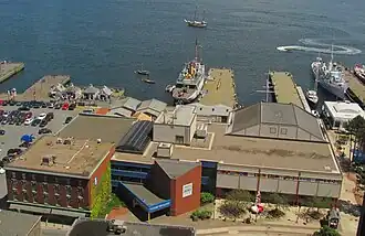 The museum was one of the first attractions to open on the redeveloped Halifax Waterfront. Its location provides the museum with several piers and boatsheds, as well as a strategic view of the Halifax Harbour, which looks seaward towards the Harbourmaster office and Georges Island and across to Dartmouth. Among its facilities is the restored 1880s Robertson Store ship chandler building, as well as modern exhibit galleries in the Devonian Wing (the modern museum building). HMCS Sackville, a World War II Flower-class corvette is docked adjacent to the museum in the summer months but is not owned or administered by the museum. Also, the flags across the front of the building read, "Welcome aboard L44 38N G63 34W"--giving it's Latitude and lonGitude in degrees and minutes.