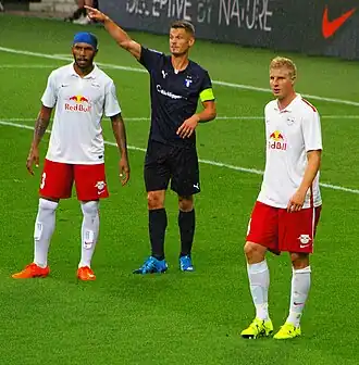Ahead of the 2015 season, it was announced that Rosenberg was the new captain for Malmö FF, succeeding Molins.[285] Rosenberg started the season well scoring two goals in the four Svenska Cupen matches.[286][287] In a 4–1 win against GIF Sundsvall in the opening game of the season, he scored and set up the club's second goal of the game.[288] Having been linked a move away from Malmö FF earlier in the season, Rosenberg put the transfer rumours aside when he signed a contract extension with the side, keeping him until 2017.[289][290] From the start of the 2015 season, Rosenberg retained his first team place as well as his captaincy of the side.[291][292][293][294][295] He only scored two goals in the next three months, which came against Hammarby on 20 April 2015 and another came against Åtvidaberg on 31 May 2015.[296][297] Between mid–July and August, Rosenberg began a goal scoring spree, adding eight goals to his tally.[298][299][300][301][302] One of the goals came in Malmö's 3–0 return leg win over Red Bull Salzburg in the third qualifying round for the 2015–16 UEFA Champions League on 5 August 2015.[303] Thanks to an aggregate score of 3–2, Malmö eliminated Salzburg for the second successive season, contributing to Salzburg's run of eight unsuccessful attempts to qualify for the Champions League since being purchased by the Red Bull company in 2005.[304][305] In their home match on 25 August 2015, Rosenberg scored the first goal as Malmö defeated Celtic 2–0, winning 4–3 on aggregate and thereby qualifying for the Champions League group stage for the second consecutive year.[306][307] He later scored four more goals later in the 2015 season, including a brace against Kalmar on 17 October 2015.[308][309][310] After serving a one-match suspension, Rosenberg returned to the starting line-up in the last game of the season against IFK Norrköping, only to be sent off in the 5th minute of the match, as Malmö lost 2–0.[311][312] Malmö FF were unable to follow up their success in European qualifying with a league title in 2015, disappointingly finishing in fifth place.[313][314] Having been out of the first team on three occasions during the 2015 season,[315][316][317] Rosenberg finished the season with 42 appearances and 16 goals in all competitions.