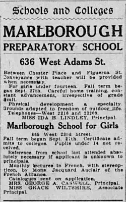 - ^ "Marlborough School". Los Angeles Evening Express. September 17, 1890. Retrieved March 14, 2024.