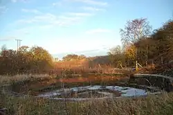 Andrews House Colliery closed in 1920. The coke works closed in 1937, with coke production transferred to the newly constructed Monkton Coke Works at the other end of the Bowes Railway near Hebburn, which would eventually become the last operational battery of coke ovens in the area, finally closing in 1991. Many of the men formerly employed at the Marley Hill ovens found work in the newly opened Blackburn Fell Drift. In later years, the coal produced at the colliery was removed in diesel-hauled sets of tubs via the Clockburn Drift, which opened in 1952 and connected underground with the Marley Hill workings. This emerged about two miles from the shafts, on the south bank of the River Derwent. Upon exiting the drift, the tubs of coal immediately crossed the river on a bridge just upstream of the Butterfly Bridge[10] at Winlaton Mill.[11] The coal was then screened and washed, and taken either to Derwenthaugh Staiths at the confluence of the Derwent and the Tyne, or was used at Derwenthaugh Coke Works. The sites of the railway sidings serving the drift, the coke ovens, and the associated coal preparation plant, power station and chemical works have been decontaminated and extensively landscaped, with the only obvious piece of evidence that mining has taken place nearby being the iron-stained water issuing from the ground above the buried drift entrance as a result of the drift acting as a drainage adit for the colliery workings.