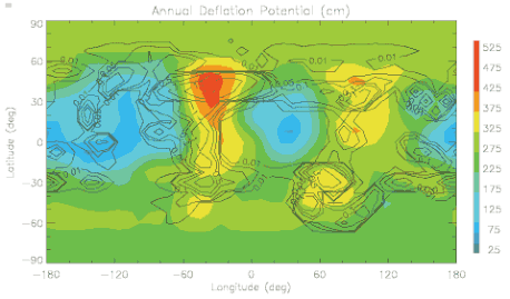 This Mars climate model is a complex 3-dimensional (height, latitude, longitude) model, which represents the processes of atmospheric heating by gases and ground-air heat transfer, as well as large-scale atmospheric motions.[1] The model also uses geophysical boundaries which are taken from spacecraft observation. These boundaries can include Martian topography, albedo, or thermal inertia.[2] By solving the dynamics and physics of the model an overall understanding of the planets processes can be estimated.[3]