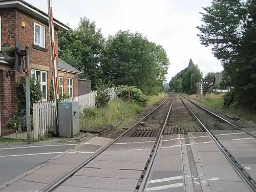 Marshbrook station was constructed in 1852 for the railway company comprising a stationmaster's house, waiting room and ticket office. The station was closed in 1958[1][2] and the building was subsequently used as a private house, before it was demolished in 2019. A signal box and level crossing remain.
