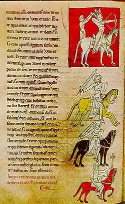 Twelfth-century depiction of Iberian cavalry: a crowned man with a bow, two knights with swords and a standard-bearer carrying a cross into battle.