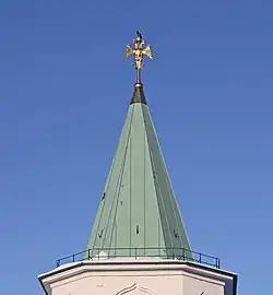 Nicholas II commissioned building of a church that became his family chapel, with outbuildings for clergy to live in and Martial Chamber, all planned in a Russian style of 17 century Yaroslavl city[8] (Russian Revival architecture), on the grounds of the Emperor's Farm Park[9] bordering Alexander Park, and the construction of the complex began in 1913 and went on until 1917-18.[8] The church was named after the Romanov royal family's patron icon Feodorovskaya Icon of the Mother of God (Our Lady of Saint Theodore), and the group of buildings ([church] campus, Rus. gorodok) after it. (Feodor is the church form and Fyodor the colloquial Russian form of the name Theodore, and Fyodorovskaya is the derivative possessive/relative adjective meaning Theodore's). The first monarch from the Romanov dynasty Michael of Russia was blessed on coronation with this icon, and the church dedication as well as the campus' 17-century Russian style were chosen to mark the 1913's tricentennial of the ruling royal house,[9] whose ascension to power signified the end of the Time of Troubles. Another church of the same name and in Old Russian style to mark the royal dynasty 300th anniversary was built as suggested by a clergyman to be built in Central Saint Petersburg next to the train station for communication with Moscow.[10]