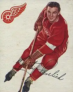 Pavelich joined the NHL Detroit Red Wings in 1947. He played 634 regular season NHL games, scoring 93 goals and 159 assists for 252 points. His post-season record is 13 goals and 15 assists for 28 points in 93 games.[2] The Red Wings won the Stanley Cup four times (1950, 1952, 1954, 1955) during his career and he played in the NHL all-star games for those seasons.
