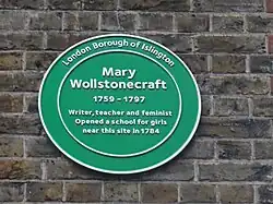 Gradually, Wollstonecraft returned to her literary life, becoming involved with Joseph Johnson's circle again, in particular with Mary Hays, Elizabeth Inchbald, and Sarah Siddons through William Godwin. Godwin and Wollstonecraft's unique courtship began slowly, but it eventually became a passionate love affair.[63] Godwin had read her Letters Written in Sweden, Norway, and Denmark and later wrote that "If ever there was a book calculated to make a man in love with its author, this appears to me to be the book. She speaks of her sorrows, in a way that fills us with melancholy, and dissolves us in tenderness, at the same time that she displays a genius which commands all our admiration."[64] Once Wollstonecraft became pregnant, they decided to marry so that their child would be legitimate. Their marriage revealed the fact that Wollstonecraft had never been married to Imlay, and as a result she and Godwin lost many friends. Godwin was further criticized because he had advocated the abolition of marriage in his philosophical treatise Political Justice.[65] After their marriage on 29 March 1797, Godwin and Wollstonecraft moved to 29 The Polygon, Somers Town. Godwin rented an apartment 20 doors away at 17 Evesham Buildings in Chalton Street as a study, so that they could both still retain their independence; they often communicated by letter.[66][67] By all accounts, theirs was a happy and stable, though brief, relationship.[68]