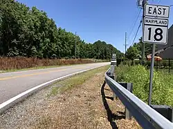 MD 18S begins at US 50 opposite MD 18B's eastern terminus. At the intersection with MD 656 (Friels Road) and Outlet Center Drive, which heads into the Queenstown Premium Outlets, the state highway turns north and reaches its eastern terminus at a superstreet intersection with US 301 (Blue Star Memorial Highway).[1][4] MD 18C begins at US 301 opposite the eastern terminus of MD 18S. The state highway heads northeast as Main Street through the town of Queenstown, where the highway intersects MD 456 (Del Rhodes Avenue) and passes near the historic home Bowlingly. After leaving the town, MD 18C's name changes to 4-H Park Road and the road passes through farmland. The state highway passes the namesake park of the youth agricultural organization shortly after crossing Reed Creek. MD 18C passes by the historic home Bachelor's Hope before the highway reaches its eastern terminus at MD 213 (Centreville Road) on the southwestern edge of Centreville.[1][5]
