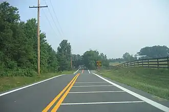 MD 97 crosses the Patuxent River into Howard County, where it becomes Roxbury Mills Road, named after the Roxbury Mill built in 1753.[1] It continues north, passing areas of woods and farms along with suburban residential developments.[2] The road heads through the community of Glenwood and continues through agricultural areas before intersecting MD 144 (Frederick Road) in the community of Cooksville. A park and ride lot is located at the northeast corner of this intersection.[1][2] A short distance later, the route has a diamond interchange with I-70/US 40. Past this interchange, MD 97 becomes Hoods Mill Road and passes rural residential areas, intersecting Old Frederick Road.[1][2] From here, the road winds through a mix of woods, farm fields, and residences before crossing the South Branch of the Patapsco River.[1][2]