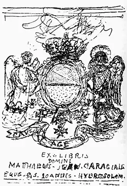 Mateiu Caragiale's interest in heraldry and genealogy mirrored his tastes and outlook on the world, which have been described as "snobbery", "aestheticism", and "dandyism",[2][22][109][110][111] as well as the love of history he displayed throughout his career.[112] It was sparked during his college years, when he would fill his notebooks with sketches of blazons, and as attested by various drawings he produced throughout his life.[113] He also developed an enduring curiosity for astronomy, magic, as well as botany and agronomy,[114] and kept detailed notes recording the deaths of all Romanian aristocrats who were his contemporaries.[35]