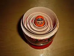 The inspiration for matryoshka dolls is not clear. Matryoshka dolls may have been inspired by a nesting doll imported from Japan.[5][7] The Children's Education workshop where Zvyozdochkin was a lathe operator received a five piece, cylinder-shaped nesting doll featuring Fukuruma (Fukurokuju) in the late 1890s,[8] which is now part of the collection at the Sergiev Posad Museum of Toys.[8] Other east Asian dolls share similarities with matryoshka dolls such as the Kokeshi dolls,[4][9] originating in Northern Honshū, the main island of Japan, although they cannot be placed one inside another, and the round hollow daruma doll depicting a Buddhist monk.[9][10] Another possible source of inspiration is the nesting Easter eggs produced on a lathe by Russian woodworkers during the late 19th Century.[3][11]