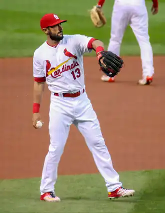 After leading the NL in OPS (1.008) for the first half of the season, Carpenter was selected as a reserve on July 5 for the All-Star Game at Petco Park in San Diego.[74] The Cardinals placed him on the 15-day DL on July 7 with an abdominal oblique strain.[75] After returning from the DL, he played in 51 games, batting .229, having a .410 slugging percentage, and a .726 OPS. He indicated he was still unable to swing properly after returning from the oblique injury. He completed the season having appeared in 129 games, and batting .271 with a career-high .885 OPS, twenty home runs, 36 doubles, and 68 RBIs.[76] His 81 walks placed seventh and 135 adjusted OPS+ eighth in the league. On defense, he made at least 40 appearances each at first base, second base, and third base.[2]