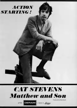 After recording, Hurst brought the tapes of "Matthew and Son" back to Tony Hall, who still remained dismissive of it.[13] Allan Keen, a disc jockey on pirate radio station Radio London was instrumental in the song's success, with Hurst bringing a copy of the song to him. Though Keen did not like the song either, he agreed to play it on his show to "see if it would catch on".[13][20] Proving to be a popular song, Deram released "Matthew and Son" as Stevens's second single on 30 December 1966, with another of Stevens's compositions, "Granny", on the B-side.[3][20][nb 6] To promote the single, Stevens was in January 1967 called onto various light entertainment television shows, including Ready Steady Go! and Top of the Pops.[26] According to Hurst, when recording a radio session for the BBC Light Programme, Hall came rushing into the recording studio to "tell them [Hurst and Stevens] that 'Matthew and Son' had sold 30,000 copies in one day.[13]