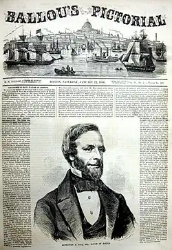 In 1851, Ballou and Frederick Gleason established the weekly paper Gleason's Pictorial Drawing-Room Companion.[3] It was inspired by The Illustrated London News.[4] The first issue appeared on May 3, 1851, and declared: "The object of this paper is to present, in the most elegant and available form, a weekly literary melange of notable events of the day. Its columns are devoted to original tales, sketches, and poems, by the best American authors, and the cream of the domestic and foreign news; the whole well spiced with wit and humor."[5] In November 1854, Ballou bought out Gleason and changed the paper's name to Ballou's Pictorial Drawing-Room Companion.