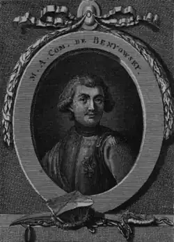 Count Maurice Benyovszky de Benyó et Urbanó (Hungarian: Benyovszky Máté Móric Mihály Ferenc Szerafin Ágost; Polish: Maurycy Beniowski; Slovak: Móric Beňovský; 20 September 1746 – 24 May 1786)[1] was a military officer, adventurer, and writer from the Kingdom of Hungary, who described himself as both a Hungarian and a Pole.[2] He is considered a national hero in Hungary, Poland, and Slovakia.