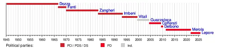 | 1 | | Giuseppe Dozza (1901–1974) | 7 April 1946 | 19 June 1951 | PCI | PCI • PSI | 1946 |