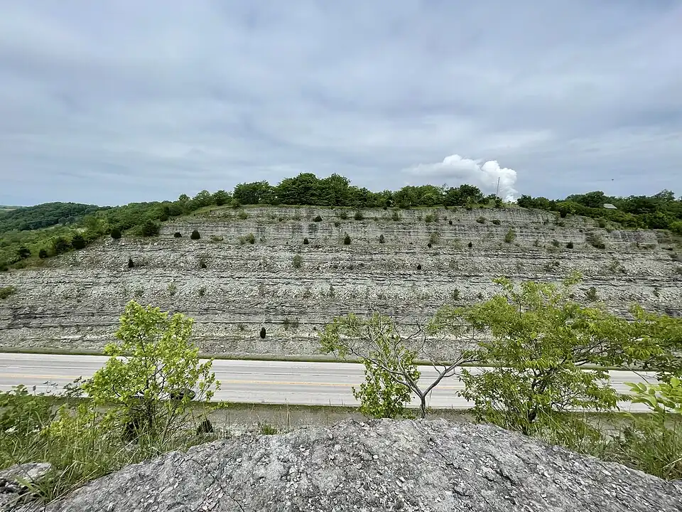 The Maysville roadcut, located in northeastern Kentucky, features upper Ordovician rock and fossils. Maysville is located in Mason County, Kentucky, and contains a large roadcut along U.S. Route 68. The cut was human-made in the 1950s and consists of rock that is roughly 450 million years old.[1] Maysville provides an opportunity to observe the stratigraphy of the formations present of the Ordovician time period.