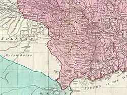 The Bhanja family, which ruled Mayurbhanj State, holds a significant place in the district's history. The Bhanjas of Khijjinga mandala governed the western region of the present-day Mayurbhanj district, including parts of Kendujhar and West Singhbhum districts, with their headquarters at Khiching after the fall of the Buddhist Bhauma-Kara dynasty. The progenitor of present-day Bhanjas of Khijjinga mandala divided the territory into two segments, each led by one ruler, effectively forming two full-fledged states. One relocated the capital from Khiching to Haripur and subsequently renamed the territory as Mayurbhanj State, while the other moved it to Kendujhargarh and named it Keonjhar State after Delhi Sultanate Feroz Shah Tughlaq plundered the kingdom during his invasion of Odisha in 1361 CE, when he marched through Manbhum, Singhbhum, and Mayurbhanj.[11] In 1508, the state came under Mughal rule. During Mughal conquest from 1592 to 1751, Mayurbhanj was an extensive domain that comprised 12 Zamindari, 42 kila in total, and, according to Raja Man Singh, 18 forts within the state, including Bhanjbhum, Mantri, Hariharapur, Dewalia, Purunia, Karkachua, Bamanghati, and Sarhonda. The state also held sway over several surrounding Zamindari Estates, including Nilgiri, Porahat, Saraikela, Kharsawan, Barabhum, Patharhai, Narsinhpur, Dipa Kiarchand, Jhamirapal, Jamkunda, Chargarh, Talmunda, Tamar, and Birkul during the early period of Mughal rule. All of these territories encompassed present-day Kendujhar, Balasore, Singhbhum, and large parts of the undivided Midnapore districts. Raja Krushna Chandra Bhanja took advantage of the disturbed conditions around the last years of Shah Jahan and enlarged his territory to the coast of the Bay of Bengal, covering the area from Jaleswar to Bhadrak. He was however defeated and executed by Khan-e-Dauran, the general of Emperor Aurangzeb.