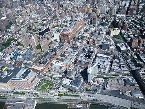 A catalyst for even greater transformation of the area was the opening in June 2009 of the first segment of the High Line linear park.[21] A former elevated freight railroad built under the aegis of Robert Moses, it opened to great reviews in the District (and in Chelsea to the north) as a greenway modeled after Paris's Promenade Plantée.[22] Thirteen months earlier, the Whitney Museum of American Art had announced that it would build a second home, designed by Renzo Piano, at 99 Gansevoort Street, just west of Washington Street and adjacent to the southernmost entrance to the High Line; and on May 1, 2015, the museum opened at this site.[23][24] These were turning points in the changes experienced by the neighborhood over the first two decades of the 21st century, transforming it from a gritty manufacturing district into a bustling high-end retail, dining, and residential area, as documented by photographer Brian Rose in his 2014 book Metamorphosis.[25]