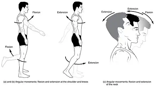 Extension is the opposite of flexion, a straightening movement that increases the angle between body parts.[12] For example, when standing up, the knees are extended. When a joint can move forward and backward, such as the neck and trunk, extension is movement in the posterior direction.[10] Extension of the hip or shoulder moves the arm or leg backward.[11] Even for other upper extremity joints – elbow and wrist, backward movement results in extension. The knee, ankle, and wrist are exceptions, where the distal end has to move in the anterior direction for it to be called extension.[13]