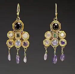 The jewelry of the Byzantine Empire often features religious images or motifs such as the cross, even in pieces that were for secular use. Elaborate Roman styles were continued, but with growing use of cloisonné enamel. The main commissions for gold work and jewelry came from the Court or the Church.[18] As such, much of the jewelry was very religious, involving ornate crosses and depictions of the afterlife or of saints' lives.[19] The Byzantines excelled in inlaying and their work was enormously opulent, involving precious stones, glass and gold.[20] Not much of Byzantine jewelry remains, as this period marked the end of burying a person's jewelry with them, so much of the truly extravagant jewelry – depicted in mosaics and paintings – has disappeared.[21] Carolingian jewelry is similar to Byzantine in that the modern world has lost almost all of it, except that which was created for religious purposes.[22] The Carolingians were similar to the barbarians in their love of color, but the techniques they used – especially enameling – are much more reminiscent of the Byzantines.[22] The most outstanding piece of jewelry that still remains from this period is the crown of Charlemagne, with precious stones, filigree, enamel and gold.[23] The Ottonian style is, again, very similar to the Byzantines and the Carolingians. Religion plays a main part in the jewelry that remains.[24] The Ottonian style characterizes a cross between German and Byzantine, superior in both technicality and delicacy.[24]