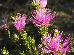 The flowers are arranged in heads at the ends of branches, with the branch continuing to grow after flowering. Each head has 1 to 4 groups of flowers in pairs or threes. The stamens are arranged in five bundles around each flower, 6 to 12 stamens per bundle, coloured pink, purple or magenta. Flowering occurs in September and October and the fruit which follow are woody capsules 4.8–6.5 mm (0.2–0.3 in) long.[2][3]