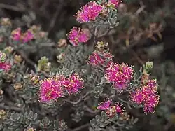 Purple, mauve, magenta or pink flowers appear in heads at or near the ends of the branches. The heads are composed of one to four groups of flowers with three flowers in each group and are up to 22 mm (0.9 in) in diameter. The stamens are arranged in five bundles around the flower, each bundle having 8 to 12 stamens. Flowering occurs between September and November and the fruit which follow are woody capsules, 4–5 mm (0.16–0.20 in) long.[2][3]