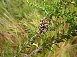The flowers are cream-coloured and arranged in spikes on the ends of branches that continue to grow after flowering and also on the sides of the branches. The spikes are up to 18 mm (0.7 in) in diameter, 25 mm (1 in) long and contain 3 to 9 groups of flowers in threes. The stamens are arranged in five bundles around the flower with 15 to 25 stamens per bundle. Flowers appear in December and January and are followed by fruit that are woody capsules 2.6–3.1 mm (0.10–0.12 in) long. The fruit retains the seeds for more than 3 years or until the plant is burned or the part bearing the fruit dies. The sepals remain as teeth around the edge of the fruit, usually for more than a year.[2]
