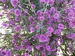 The flowers are a shade of pink to purple and are arranged in spikes on the ends of branches which continue to grow after flowering, and sometimes in the upper leaf axils. The spikes contain 2 to 9 groups of flowers in threes and are up to 10 mm (0.4 in) in diameter and 20 mm (0.8 in) long. The stamens are arranged in five bundles around the flowers and each bundle contains 2 to 5 (mostly 3) stamens. Flowering occurs between September and January and is followed by fruit which are woody capsules 2–2.5 mm (0.08–0.1 in) long in almost spherical clusters which are up to 10 mm (0.4 in) in diameter.[2][3][4]