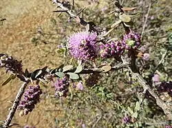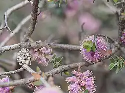 The flowers are a shade of pink to purple and are arranged in short spikes on the sides of the branches. Each spike contains 3 to 29 individual flowers and is up to 20 mm (0.79 in) in diameter. The petals are 2.4–3.1 mm (0.09–0.1 in) long and fall off as the flowers mature. The stamens are arranged in five bundles around the flowers and there are 9 to 16 stamens per bundle. The flowering period is in September or October and is followed by fruit which are woody capsules 5–6 mm (0.2–0.2 in) long with teeth around the edges and in clusters along the branches.[2][3][4]