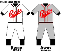 MelbourneHome – white with red trim top with "Reds" across the front, navy blue undershirt, white pants with red strip down the leg, white socks with red t-bars. Away – same as home but with grey where white is.