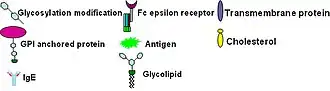 Immunoglobulin E (IgE) signaling is the first convincingly demonstrated signaling process which involves lipid rafts.[40][41][42] Evidence for this fact includes decreased solubility of Fc-epsilon receptors (FcεR) in Triton X-100 from steady state to crosslinking state,[40] formation of patches large enough to be visualized by fluorescence microscopy from gangliosides and GPI-anchored proteins,[43][44] abolition of IgE signaling by surface cholesterol depletion with methyl-β-cyclodextrin[45] and so on.