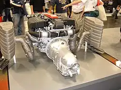 The SLR has a 232 kg (511 lb) hand-built 5.4 L; 331.9 cu in (5,439 cc) supercharged all-aluminium alloy, SOHC 3 valves per cylinder 90° V8 engine, with a bore and stroke of 97 mm × 92 mm (3.82 in × 3.62 in) and with a compression ratio of 8.8:1. The engine is lubricated via a dry sump system. The Lysholm-type twin-screw supercharger rotates at a maximum of 23,000 rpm and produces 0.9 bar (13 psi) of boost.[8] The compressed air is then cooled via two intercoolers. The engine generates a maximum power output of 626 PS (460 kW; 617 hp) at 6,500 rpm and maximum torque of 780 N⋅m (575 lbf⋅ft) between 3,250 and 5,000 rpm.[9]