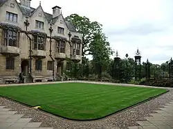 Visitors to Merton are often told that Mob Quad is the oldest quadrangle of any Oxford or Cambridge college and set the pattern for future collegiate architecture. It was built in three phases: 1288–1291, 1304–1311, and finally completed with the Library in 1373–1378.[34] But Merton's own Front Quad was probably enclosed earlier, albeit with a less unified design.[35] Other colleges can point to similarly old and unaltered quadrangles, for example Old Court at Corpus Christi College, Cambridge, built c.1353–1377.[36]