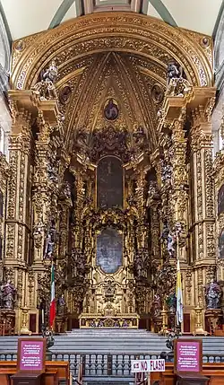 Additional sculptures were created by Sebastián de Santiago.[34] It takes its name from the statues of saintly royalty which form part of its decoration,[3] and is the oldest work in churrigueresque style in Mexico, taking 19 years to complete. At the bottom, from left to right, are six female royal saints: Saint Margaret of Scotland, Helena of Constantinople, Elisabeth of Hungary, Elizabeth of Aragon, Empress Cunegunda and Edith of Wilton.[35] In the middle of the altar are six canonized kings: Hermenegild, a Visigoth martyr; Henry II, Holy Roman Emperor; Edward the Confessor; and Casimir of Poland below, and Saints Louis of France and Ferdinand III of Castile above them. In between these kings an oil painting of the Adoration of the Magi by Juan Rodriguez Juarez shows Jesus as the King of kings. The top portion features a painting of the Assumption of Mary as celestial queen flanked by oval bas reliefs, one of Saint Joseph carrying the infant Jesus and the other of Saint Teresa of Ávila with a quill in her hand and the Holy Spirit above her, inspiring her to write.[36] In the upper part above this, there are angels carrying the attributes of the Virgin Mary such as the Sealed Fountain, the House of Gold, the Well of Living Water, and the Tower of David, and at the top is an image of God, the Father.[31]