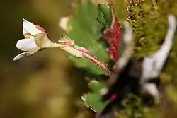 Micranthes rufidula is a species of flowering plant known by the common name rustyhair saxifrage. It is native to western North America from British Columbia to Oregon, and one location in northern California. It grows in moist, open and rocky habitat in mountainous areas. It is a perennial herb growing from a small caudex and system of rhizomes. The leaves have oval blades lined with blunt teeth borne on long petioles. The inflorescence arises on a hairy peduncle, the flowers bearing white petals.