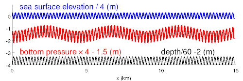 Interference of ocean waves with a fixed bottom topography. Here waves with period 12 s interact with bottom undulations of 205 m wavelength and 20 m amplitude in a mean water depth of 100 m. These conditions give rise to a pressure pattern on the bottom that travels much faster than the ocean waves, and in the direction of the waves if their wavelength L1 is shorter than the bottom wavelength L2, or in the opposite direction if their wavelength is longer, which is the case here. The motion is exactly periodic in time, with the period of the ocean waves. The large wavelength in the bottom pressure is 1/(1/L1 − 1/L2).