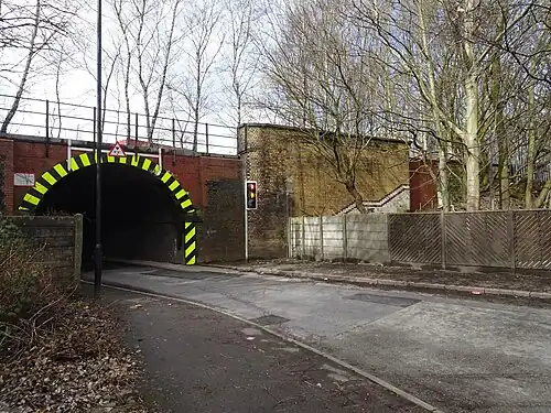 ![]() The site of the station looking north west from Grimshaw Lane. The southern end of the former platforms were just to the right of the bridge. | |||||