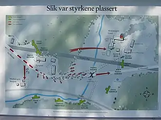 The Norwegian battle plan was to have one blockade at Sagstuen, about 1.5 kilometres (0.93 mi) west of Terningmoen and another at Midtskogen another few kilometers further west. They planned to stop the German convoy at Midtskogen, forcing the Germans to continue on foot through the deep snow, before retreating to Sagstuen where they would hold off the attackers.[3]