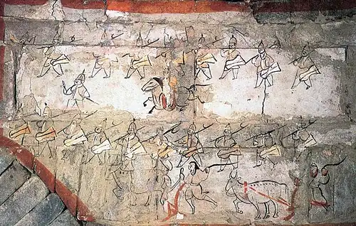 As the Han dynasty fell into disarray after the Yellow Turban Rebellion, its system of conscription and checks on military leadership broke down, giving local leaders the autonomy to recruit their own personal armies. At the heart of each army was a group of trusted Companions (親近 qinjin) consisting of family members, close friends and clansmen hired by whatever means was available to their lord. Cao Cao's earliest commanders who formed the nucleus of his army were all clansmen (Cao Xiu, Cao Zhen, Cao Chun). There was no need for conscription as the conflicts of the late Han dynasty created willing recruits who sought protection under a strong army. This type of soldier, characterized by a lack of loyalty to state or nation, primarily concerned with survival, made up the majority of the army outside of the leader's close following.[1][2] Due to the lack of loyalty among common troops, acts of heroism and courage were particularly emphasized among commanders who were expected to lead from the front. A typical example of this type of commander would be Dian Wei, a former local bully noted for his great strength, appetite, and his choice of weaponry, two halberds of immense weight, who served under Cao Cao. In 195, he personally led a group of volunteers clad in double armour (兩鎧 liang kai) against Lü Bu's forces while his liege made his escape. He was promoted to colonel of the bodyguard unit known as the Tiger Warriors and later met his death against Zhang Xiu in 197.[3][4] While echoes of Han organization continued through the formal titles of military structure, in effect the wars of the Three Kingdoms were fought between armies of bands led by individuals selected by dint of violence and charisma.[5]
