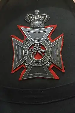 For the first and only time, the militia battalions would not only be embodied, but also see action during the Second Boer War. The 3rd battalion was embodied on 5 December 1899, with a strength of 826 officers and men. It served in the Cape Colony and the Orange Free State, guarding lines of communication and escorting convoys, and garrisoning Dewetsdorp for six months. During its time there it lost 29 officers and men. The 4th battalion was embodied twice, first from 23 January to 4 December 1900, when it remained in Aldershot, and from 6 January 1902 to 3 October 1902 when, with a strength of 852 officers and men, it was split into small detachments around the Cape and Free State. The 4th lost 16 men.[32] The Durham Artillery was embodied 1 May to 11 October 1900, a Service Company volunteered for overseas service and was sent to Zululand where they distinguished themselves fighting as infantry in the defence of Fort Prospect.[22]